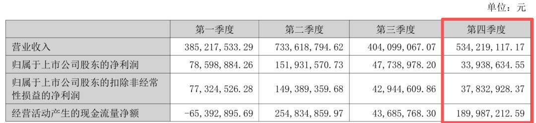 单季度来看,公司第四季度营业收入为5.34亿元,同比下降2.98%;归母净利润为3393.86万元,同比下降65.02%;扣非净利润为3783.29万元,同比下降60.87%。