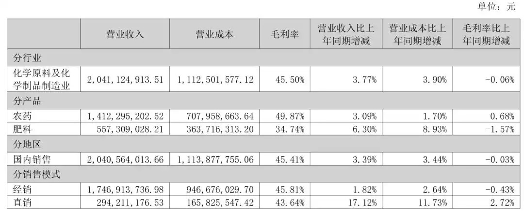 报告期内,公司主要从事行业的毛利率承压。从收入结构来看,农药作为主力产品,营收占比近七成,毛利率仅微涨0.68个百分点;肥料收入同比增6.30%但毛利率下滑1.57个百分点。分模式看,直销增速17.12%远超经销的1.82%,且毛利率提升2.72个百分点。